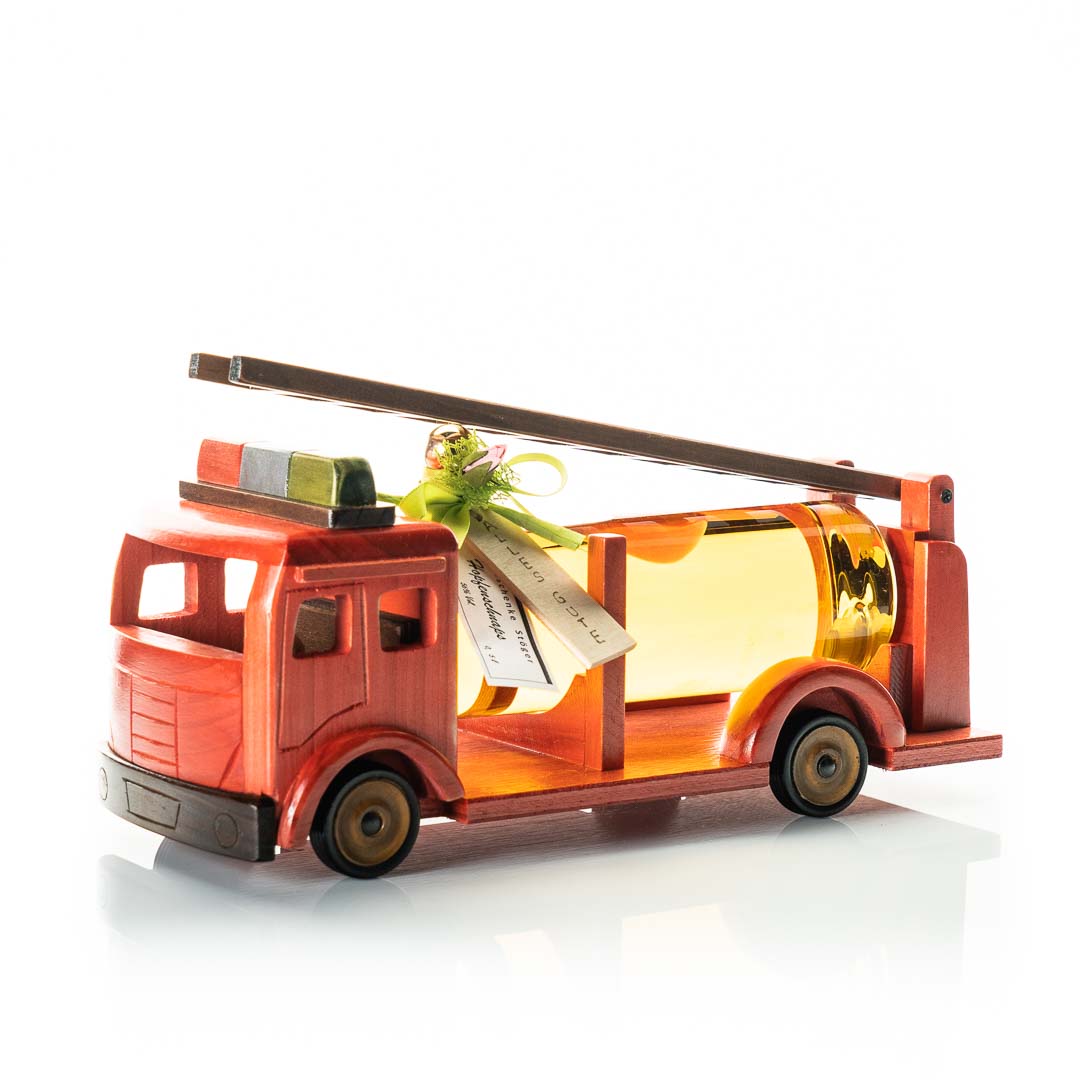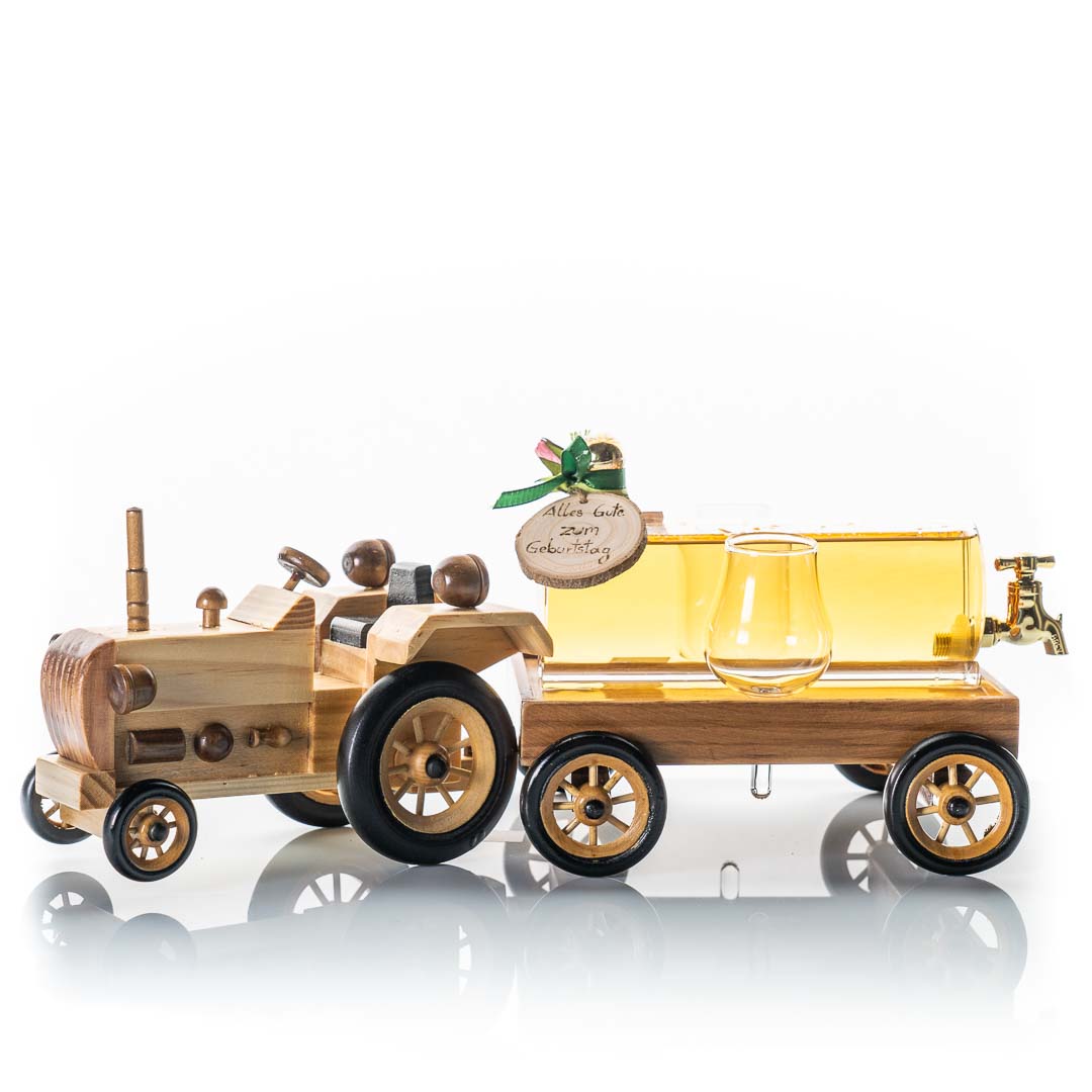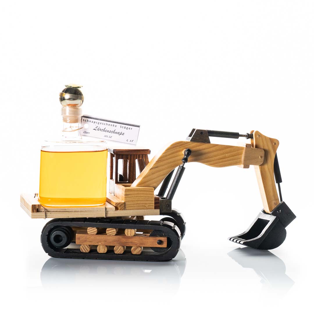 Bagger aus einer Komination aus Holz und mundgeblasener Glasflasche. Er ist in alle seiten drehbar und wendbar. Füllmenge ca 0,5l. Inhalt wählbar
