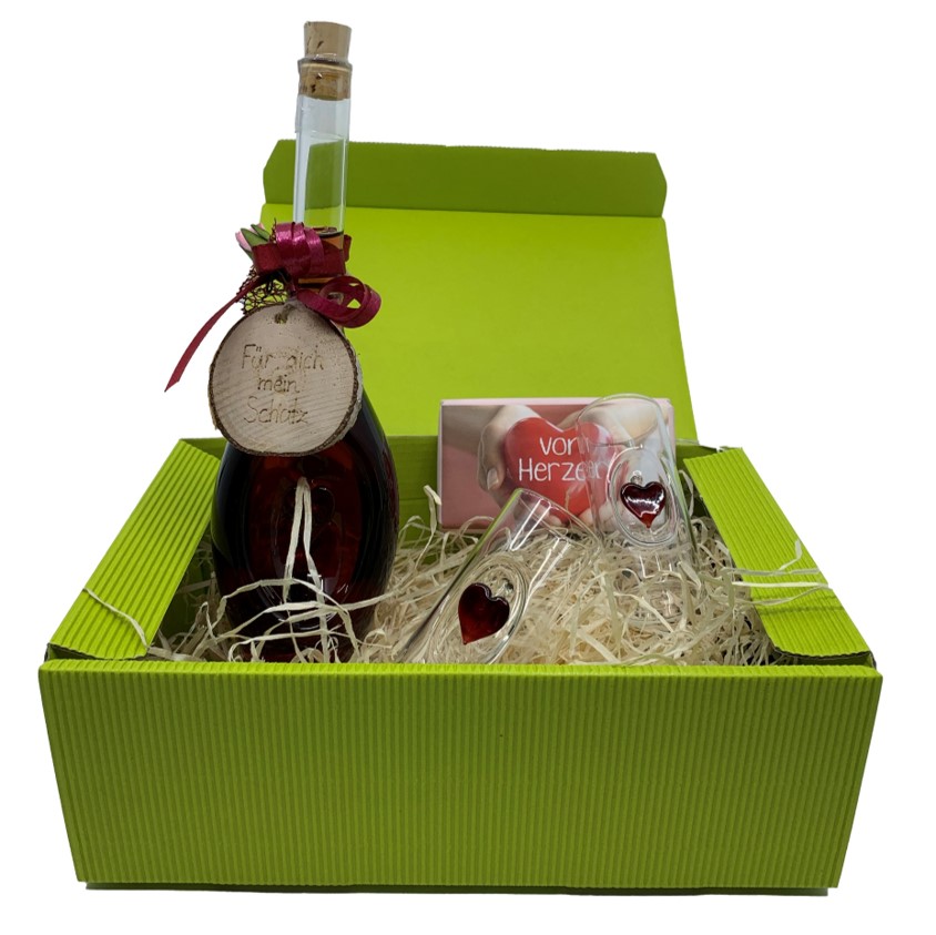 Handgefertigte, mundgeblasene Flasche mit Herz. Wahlweise mit Waldhimbeer-Grappa Likör oder Zirbenschnaps befüllt. Im Set mit passenden Schnapsgläsern und einer liebevollen Verpackung wählbar.